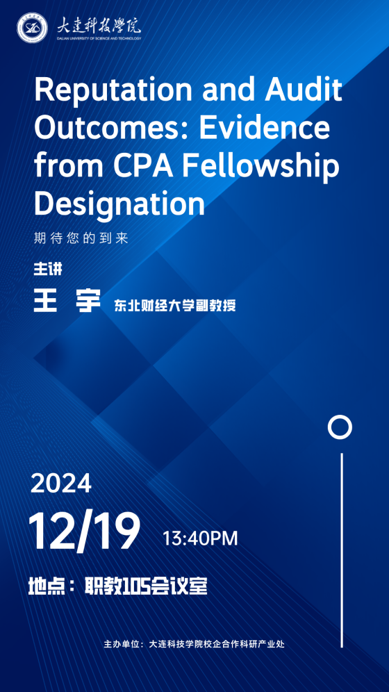 为持续推动审计理论创新,立足中国特色的审计实践,以科学的态度和创新的思维,搭建审计理论与审计实践的桥梁。12月19日,学校特邀东北财经大学副教授王宇在职教105会议室,面向经济管理学院师生作题为《Reputation and Audit Outcomes: Evidence from CPA Fellowship Designation》的学术讲座。